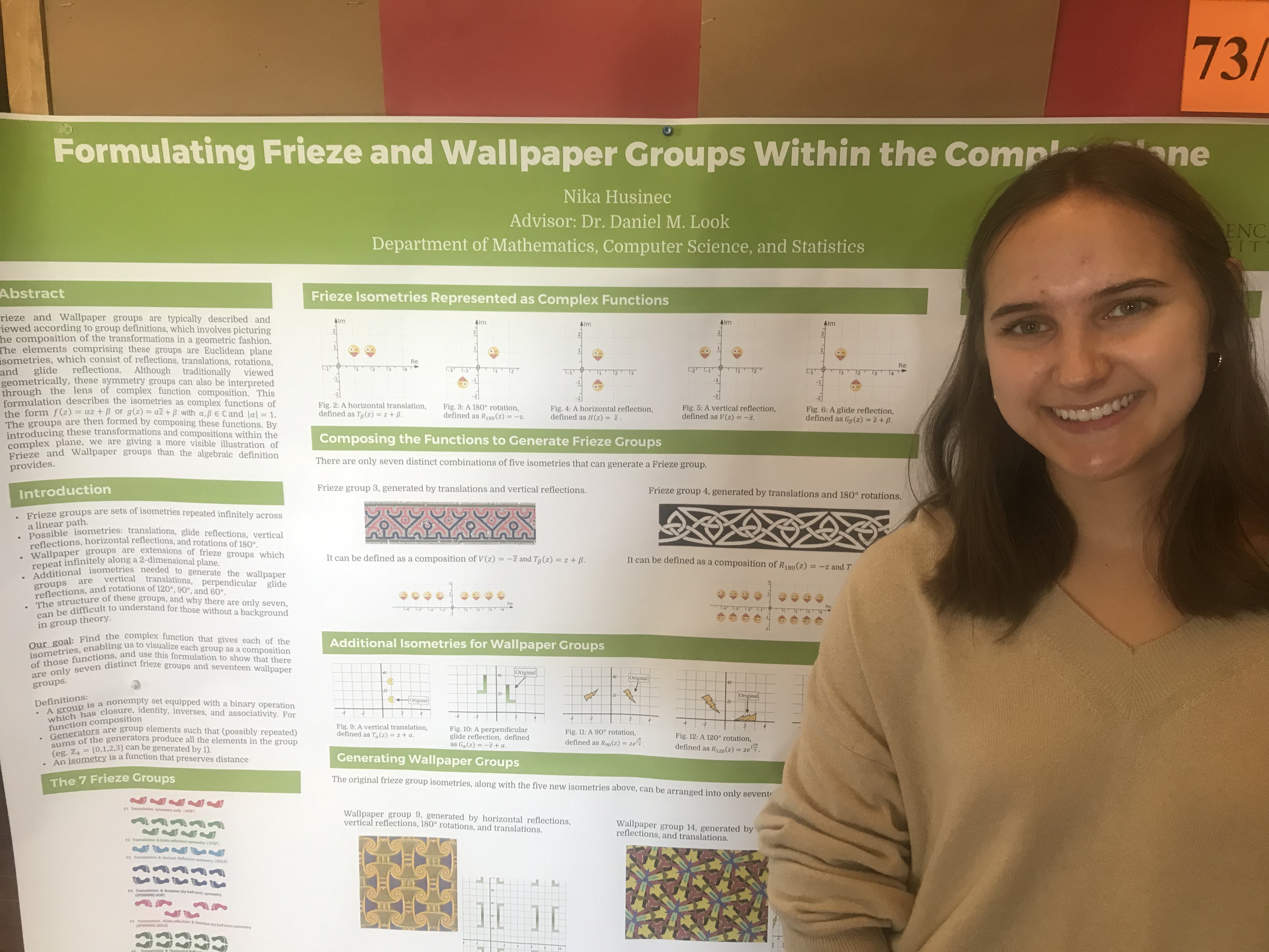 Abstract: Frieze and Wallpaper groups are typically described and viewed according to abstract algebra, which involves picturing the transformations’ compositions in a primarily geometric fashion. The elements comprising this group are Euclidean plane isometries, which consist of reflections, translations, rotations, and glide reflections. Although traditionally viewed geometrically, these symmetry groups can also be interpreted through the lens of complex function composition. This formulation describes the isometries as complex functions of the form f(z)=αz+β or g(z)=α¯z+β with β∈R, α∈C , and |α|=1. By introducing these transformations and compositions within the complex plane, we are giving a more visible illustration of Frieze and Wallpaper group elements than the algebraic definition provides.