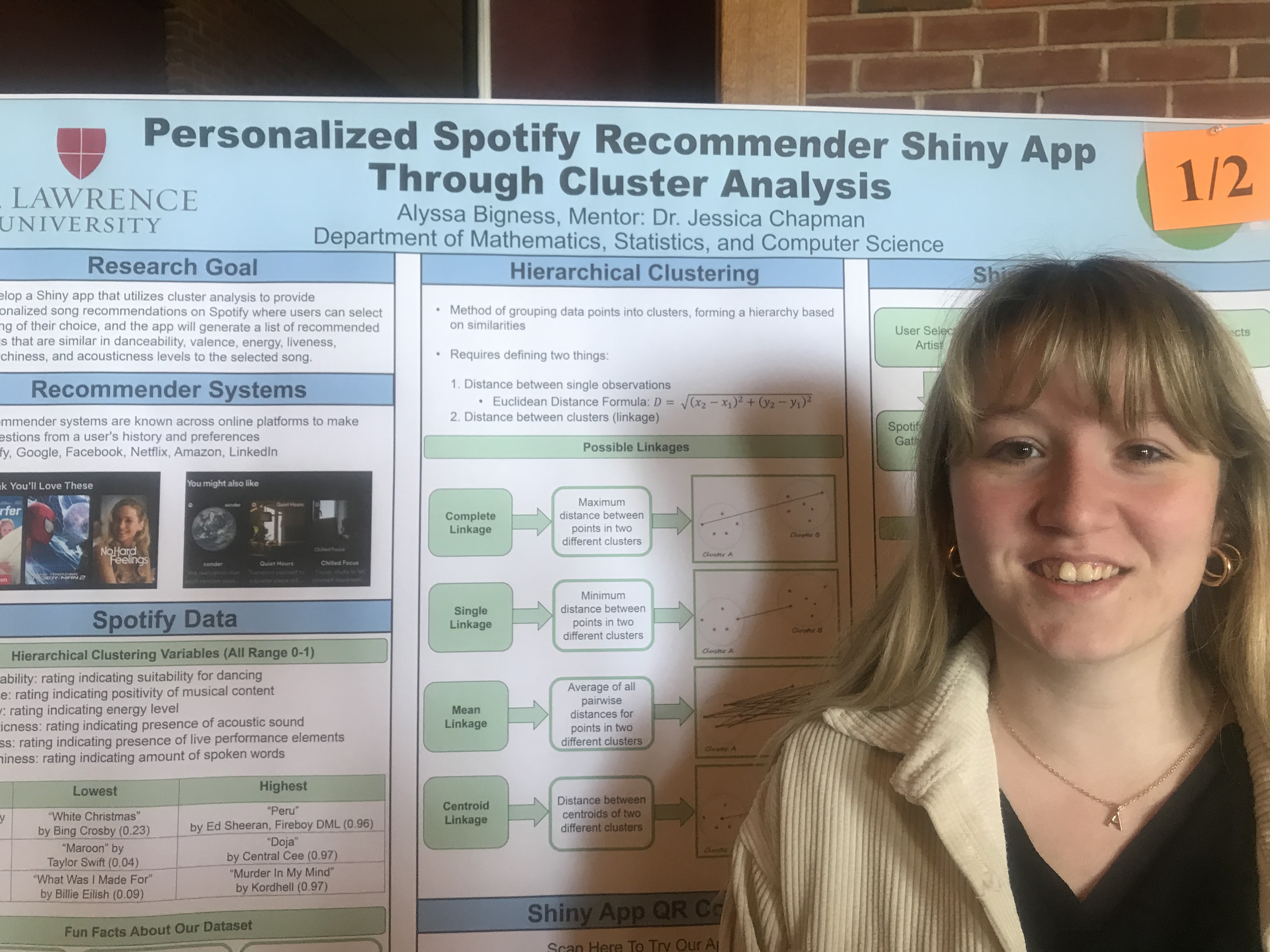 Presenter: Alyssa Bigness, Faculty Sponsor: Jessica Chapman, Department: Statistics, Title: “Personalized Spotify Recommender Shiny App Through Cluster Analysis”