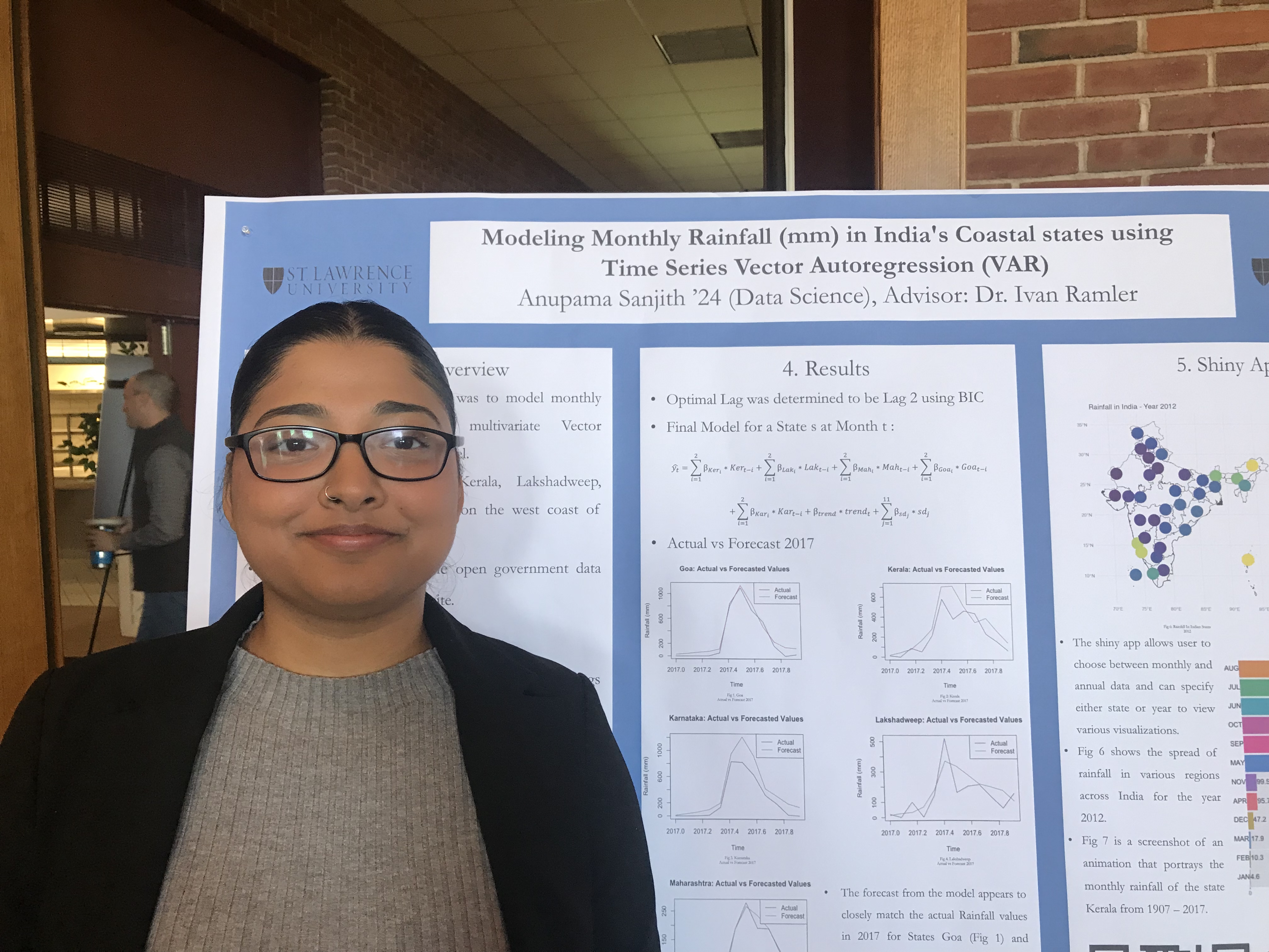 Presenter: Anupama Sanjith, Faculty Sponsor: Ivan Ramler, Department: Data Science, Title: “Modeling Monthly Rainfall (mm) in India’s Coastal states using Vector Autoregression (VAR)”