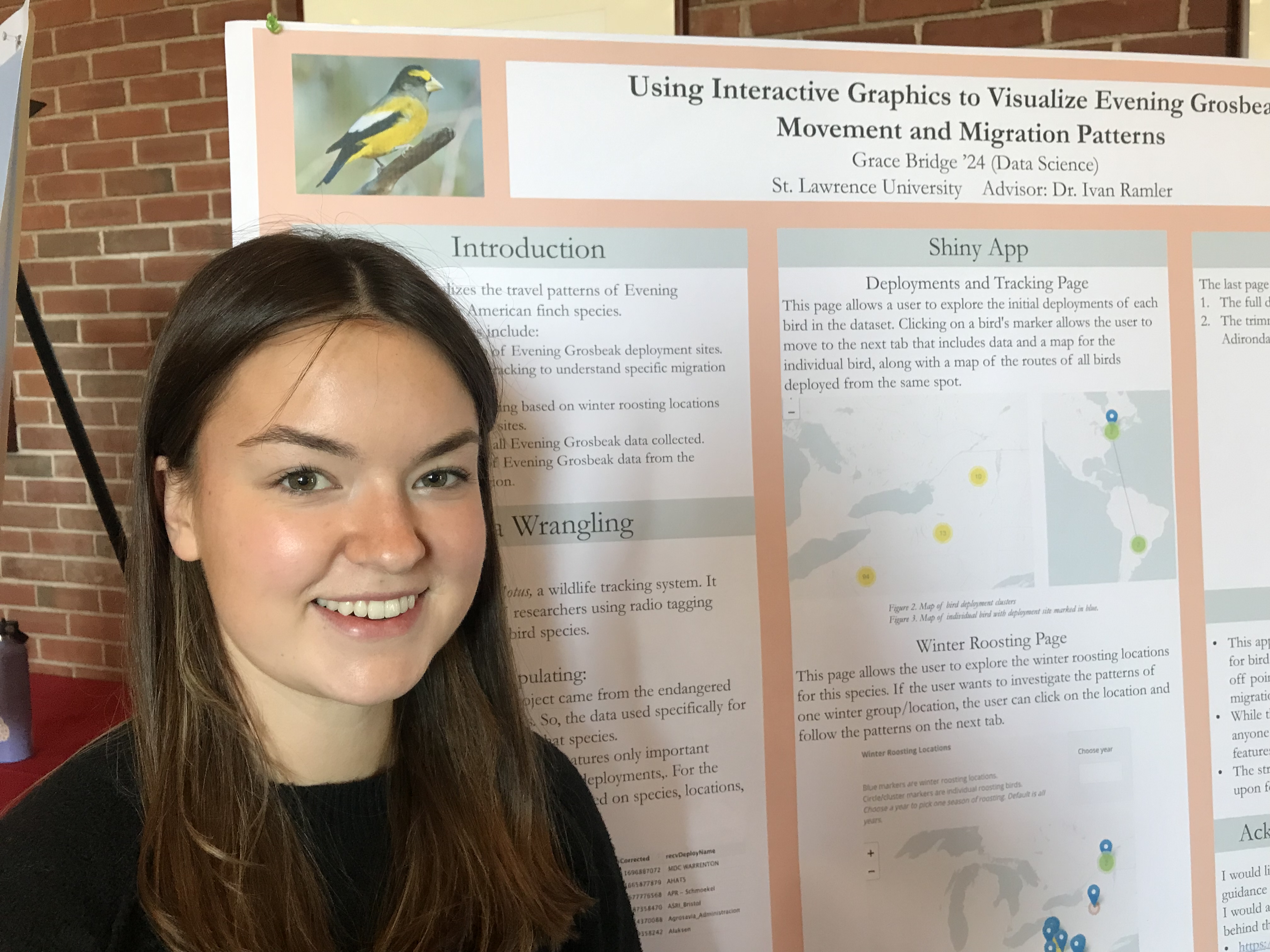 Presenter: Grace Bridge, Faculty Sponsor: Ivan Ramler, Department: Data Science, Title: “Using Interactive Graphics to Visualize Evening Grosbeak Movement and Migration Patterns”