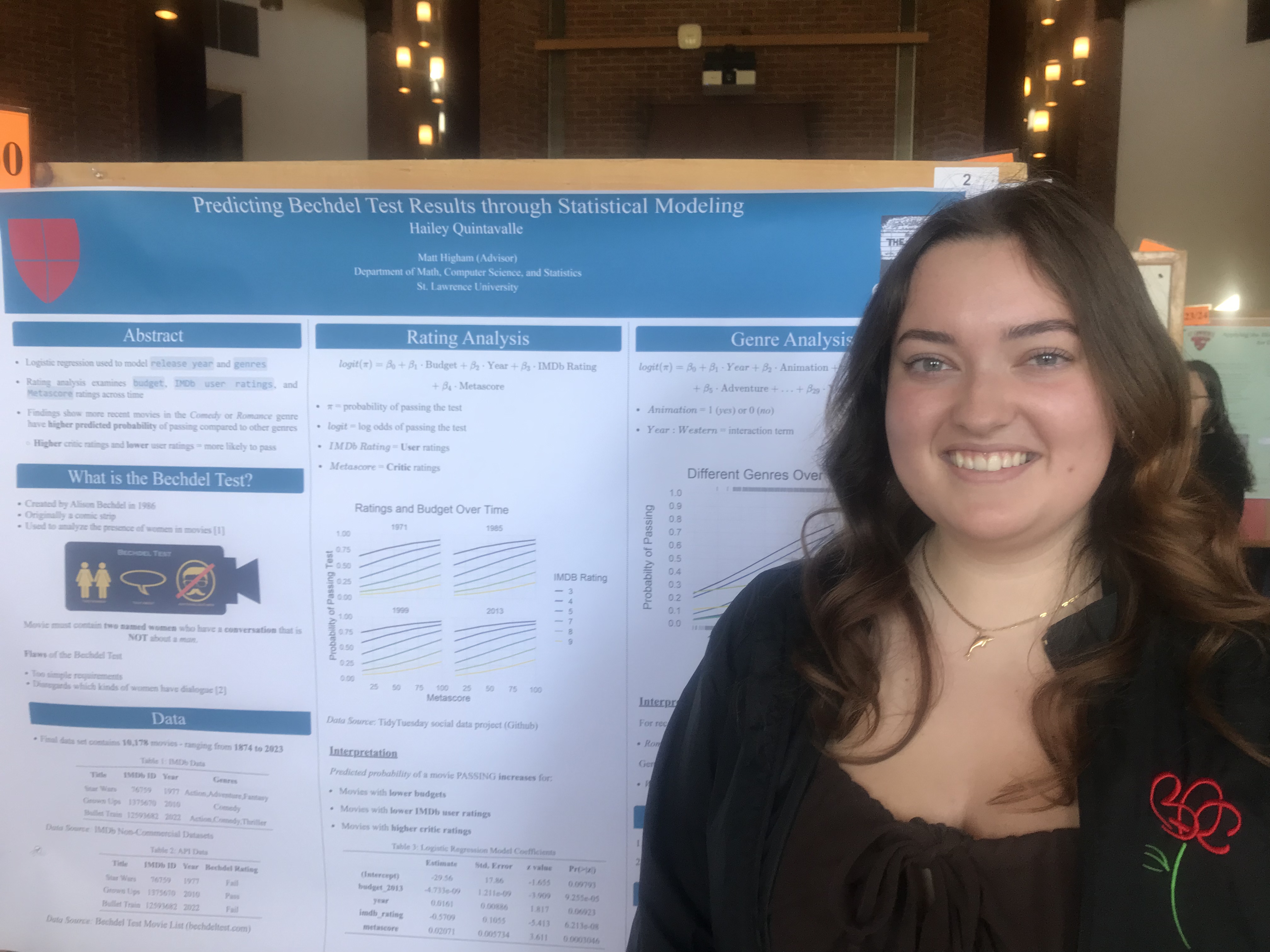 Presenter: Hailey Quintavalle, Faculty Sponsor: Matt Higham, Department: Statistics, Title: “Predicting Bechdel Test Results through Statistical Modeling”