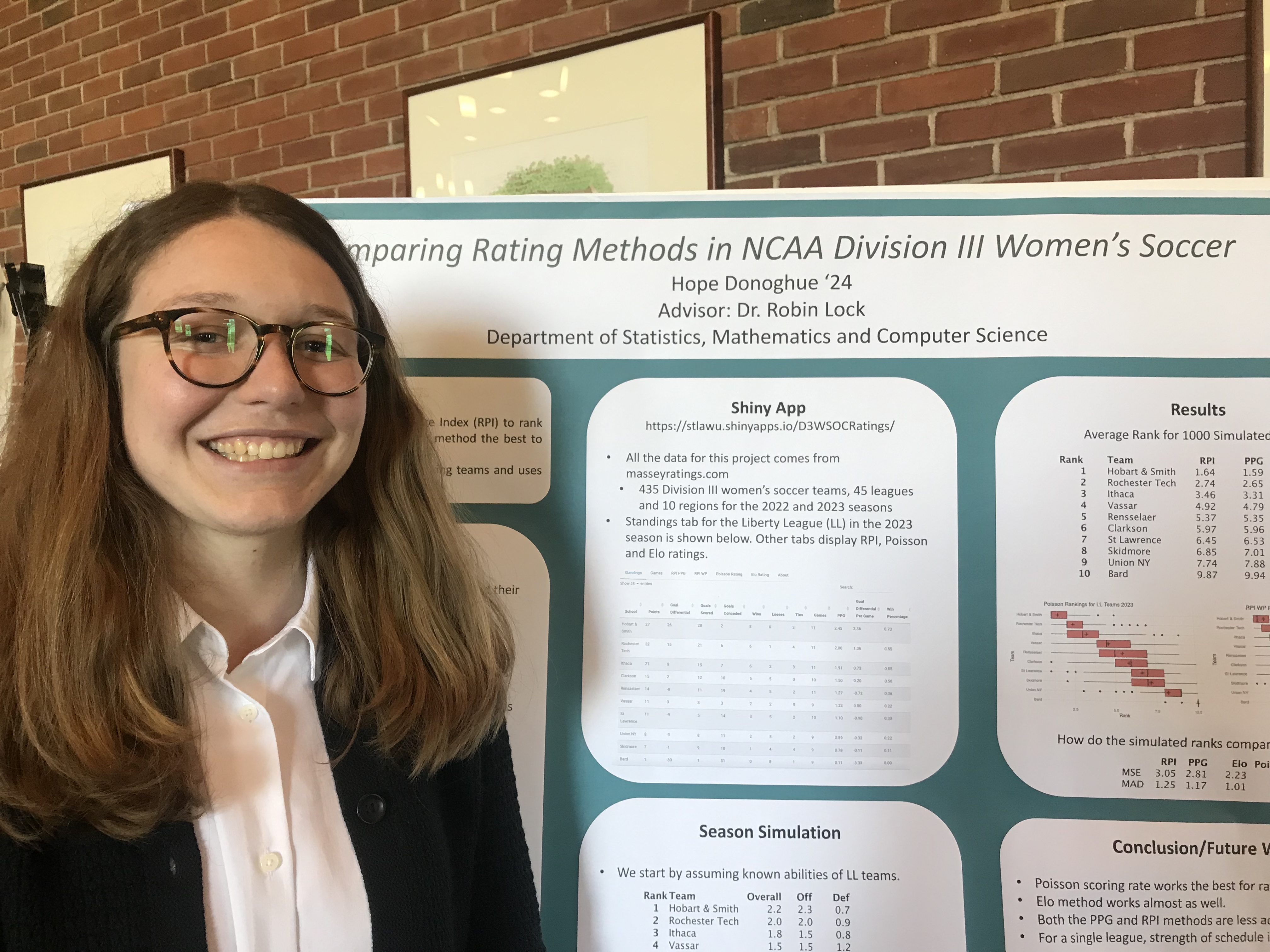 Abstract: Currently, the NCAA uses a metric called Rating Percentage Index (RPI) to rate teams in women’s soccer. RPI takes into account a team’s strength of schedule in addition to their number of wins and losses. Is this metric the most effective way to rate a team in soccer? This project aims to find the best rating method for ranking Division III women’s soccer teams. The rating methods used in this project were: Elo (originally developed for chess), total points, goal differential, points per game and a model based on Poisson scoring rates. An interactive Shiny App, either sorted by region or league, was created to display the ratings generated by each method for the respective teams. We then used simulation in R to compare how each rating method performed on the data.