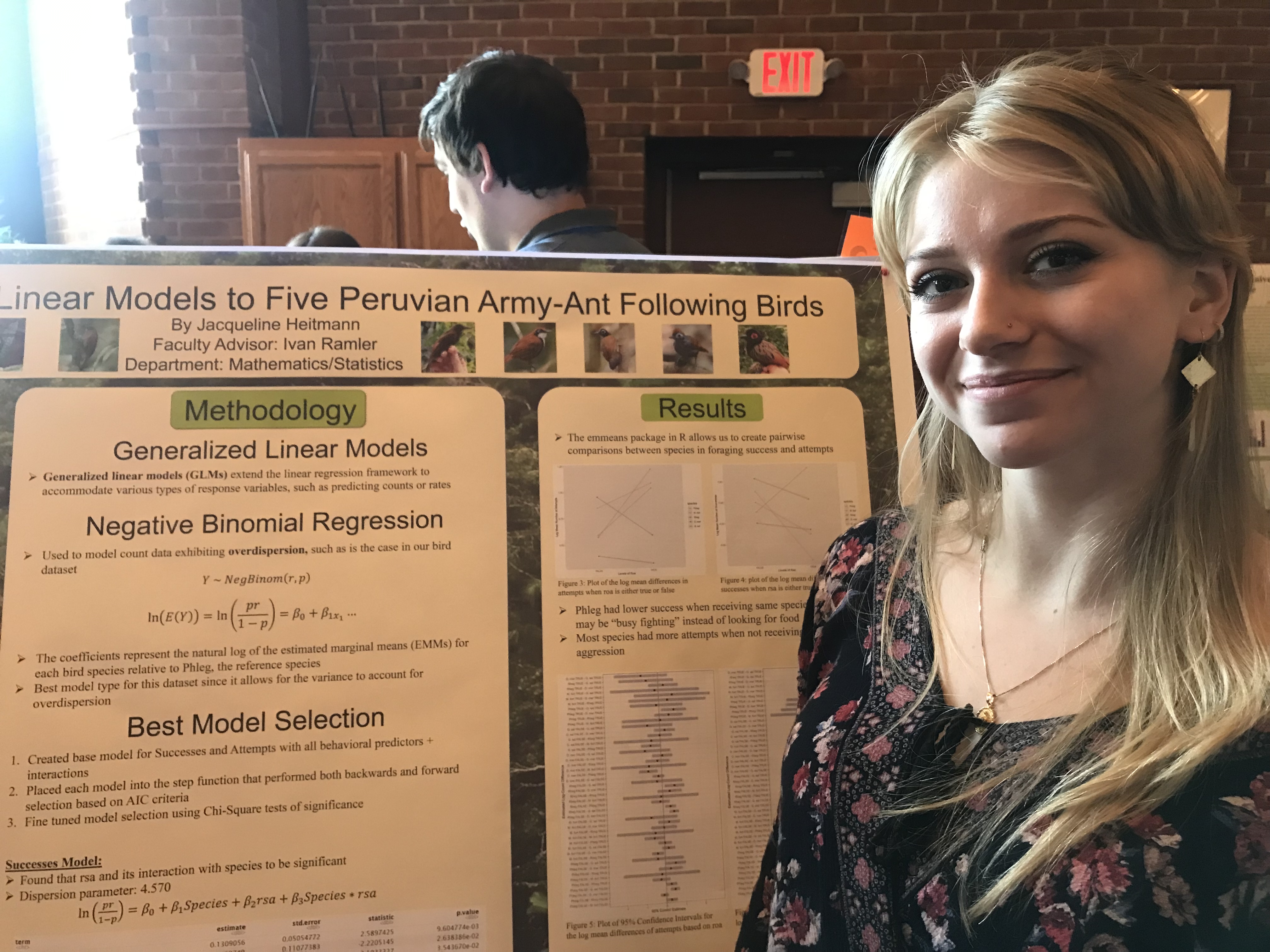 Presenter: Jacqueline Heitmann, Faculty Sponsor: Ivan Ramler, Department: Statistics, Title: “Applying Generalized Linear Models to Five Peruvian Army-Ant Following Birds”