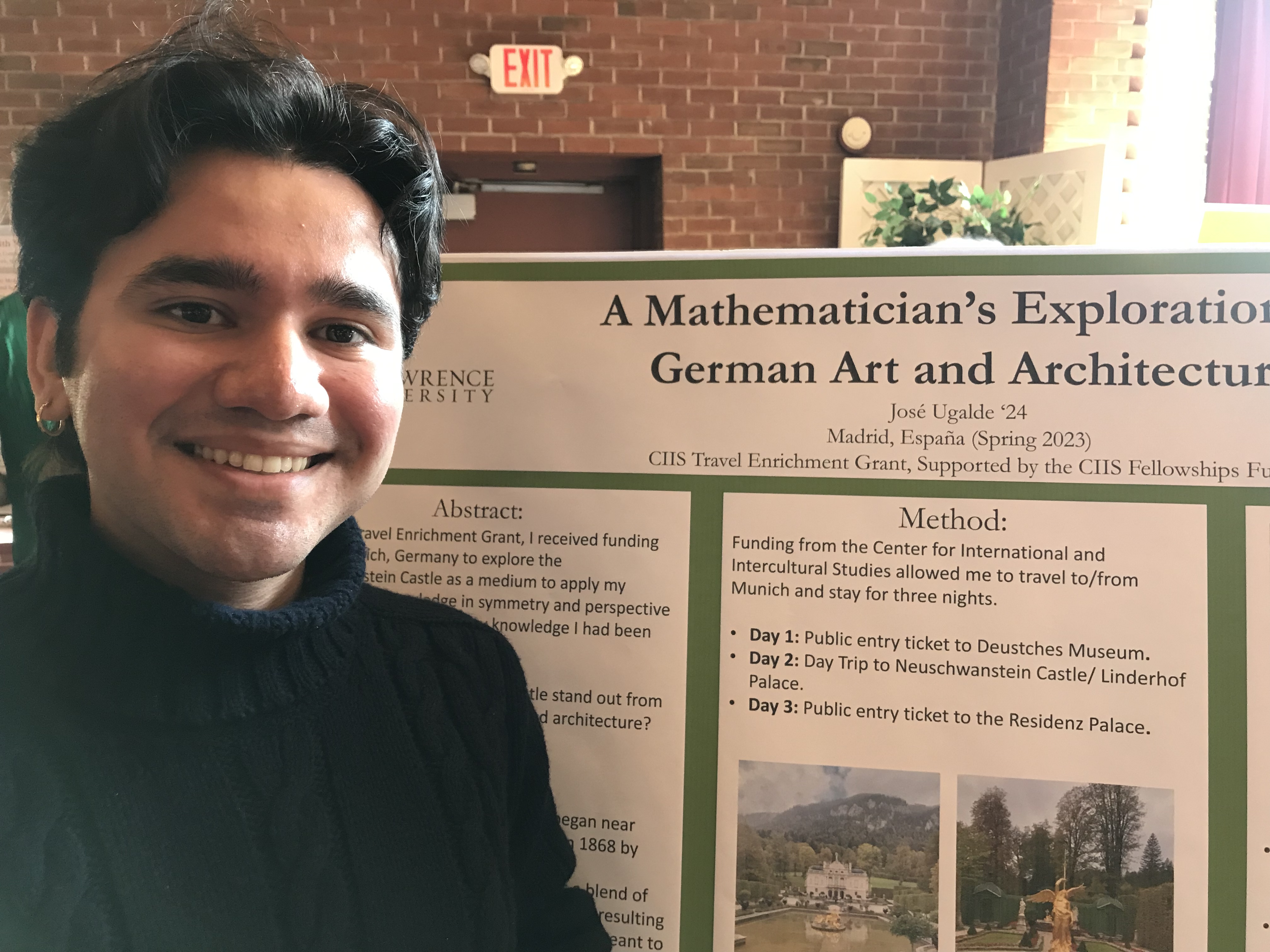 Abstract: For my enrichment experience, I travelled to Munich, Germany to explore German art and architecture from my own perspective as a Mathematics major. Exploring German art had been a great interest of mine since I have an interest in learning German, plus, having taken a History of Mathematics course with Dr. Duncan Melville, the contents of that class also inspired an interest in European art and its interstection with mathematics. From Munich, I visited the Neuschwanstein Castle, a site I believe to be a pinnacle of 19th century German art and architecture all together in one site. Here, I learned about the many French influences that King Ludwig II had been inspired by during the construction of his dream castle, while also making my own mathematic observations of symmetry, perspective, and golden ratios.