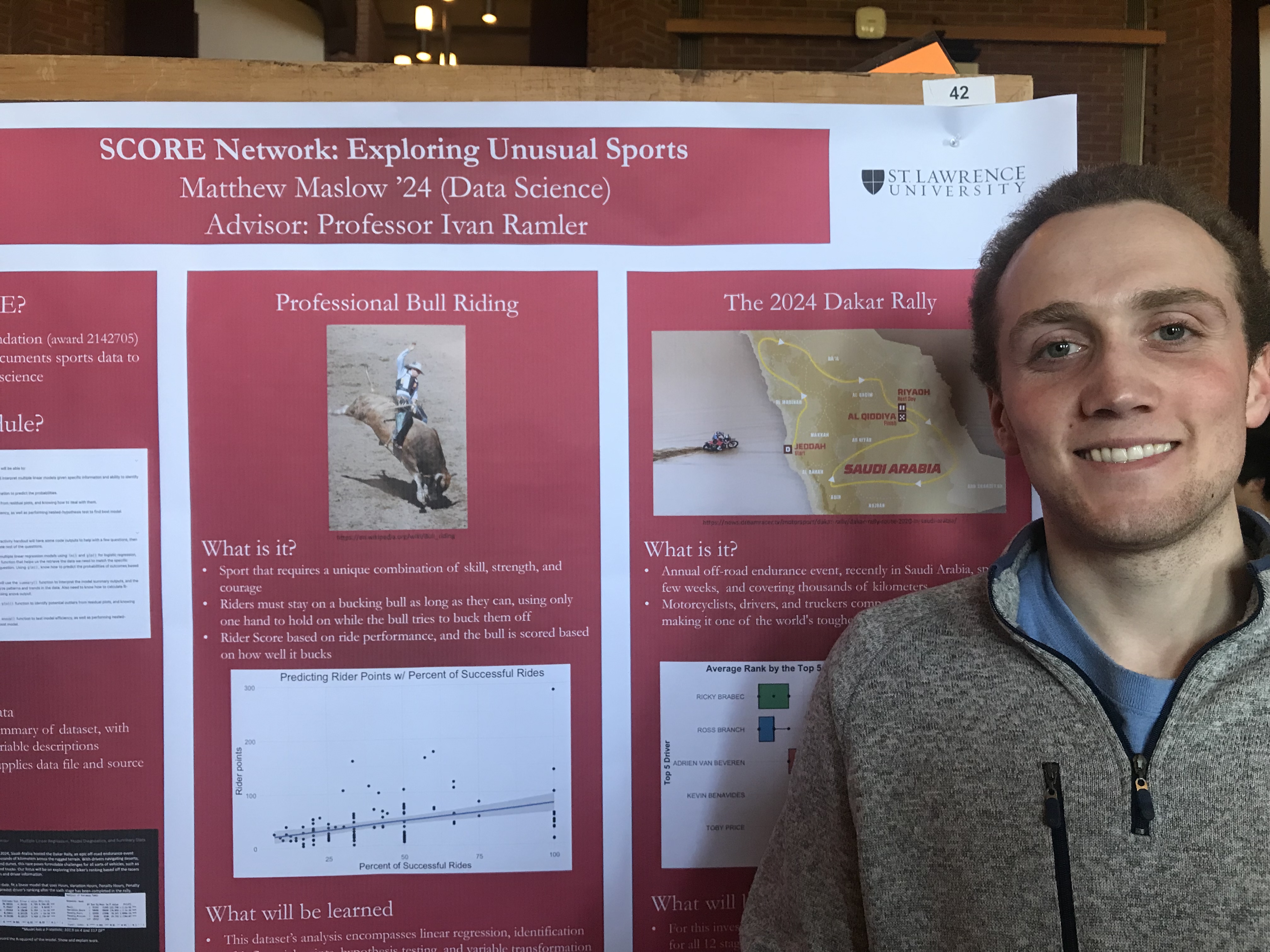 Abstract: The SCORE Network, funded by the National Science Foundation, acquires, cleans, manipulates, and documents sports data to create educational resources aimed at advancing data science learning, particularly among underrepresented populations and minorities. It focuses on developing and disseminating educational resources and frameworks, with a specific emphasis on sports analytics. This project focuses on data from the Professional Bull Riding (PBR) and the Dakar Rally in Saudi Arabia. The PBR dataset investigates a collection of professional bull riders and the bulls, along with their statistics from the 2023 season for the Touring Pro Division. This dataset’s analysis encompasses linear regression, identification of influential points, hypothesis testing, and variable transformation. For context, the Dakar Rally is an annual off-road endurance event known for its challenging terrain and extreme conditions, where participants race motorbikes, cars, trucks, and other vehicles over thousands of kilometers across various landscapes, testing their skills and endurance. The Dakar Rally dataset investigates the 2024 Saudi Arabia Dakar Rally biker rankings and times throughout all 12 stages, including driver information and rankings. This dataset’s analysis will exemplify data visualization, uncovering patterns and insights within the race dynamics.
