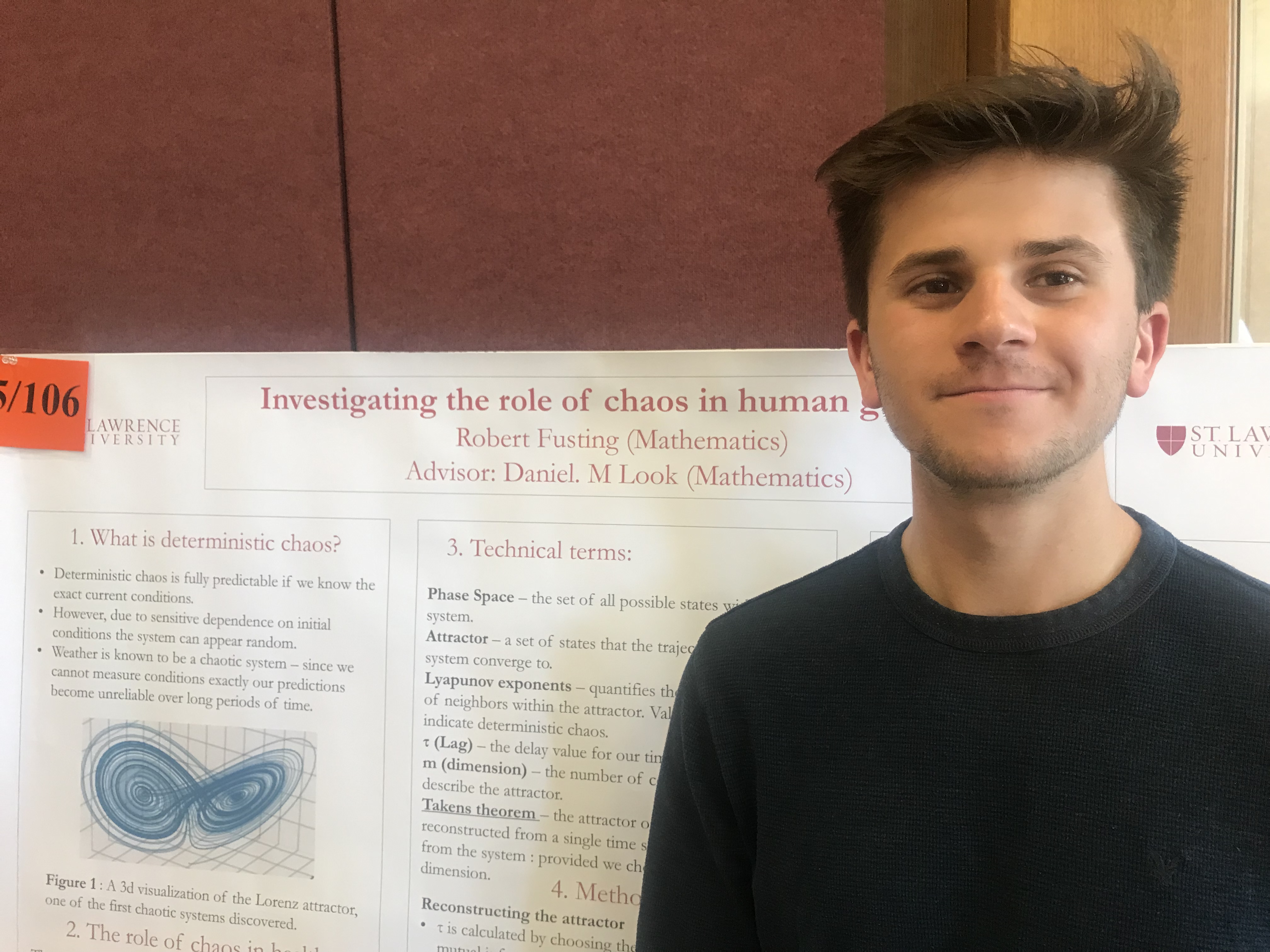 Abstract: Although “chaos” is typically thought of as “random,” systems that are mathematically chaotic are deterministic, yet appear random due to sensitive dependence on initial conditions. It has been observed that systems in the human body, such as the nervous system, cardiovascular system, and human gait, exhibit properties of mathematical chaos. Furthermore, it has been hypothesized that there is a relationship between the chaotic nature of a system and the health of that system with research suggesting that a decrease in chaos indicates a degradation of proper function. Our research investigates this phenomenon in human gait, examining the gaits of healthy individuals and those with Parkinson’s to determine if there is a difference in chaotic properties. Additionally, we repeat this process to evaluate differences in chaotic properties of individuals before and after doing Thai Chi regimes.