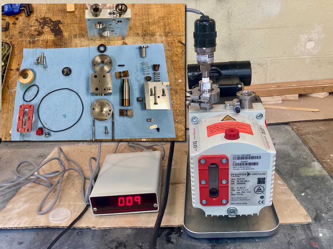 Vacuum pump rebuilt for GC/Mass-spectrometer. Inset image shows the insides of the pump.