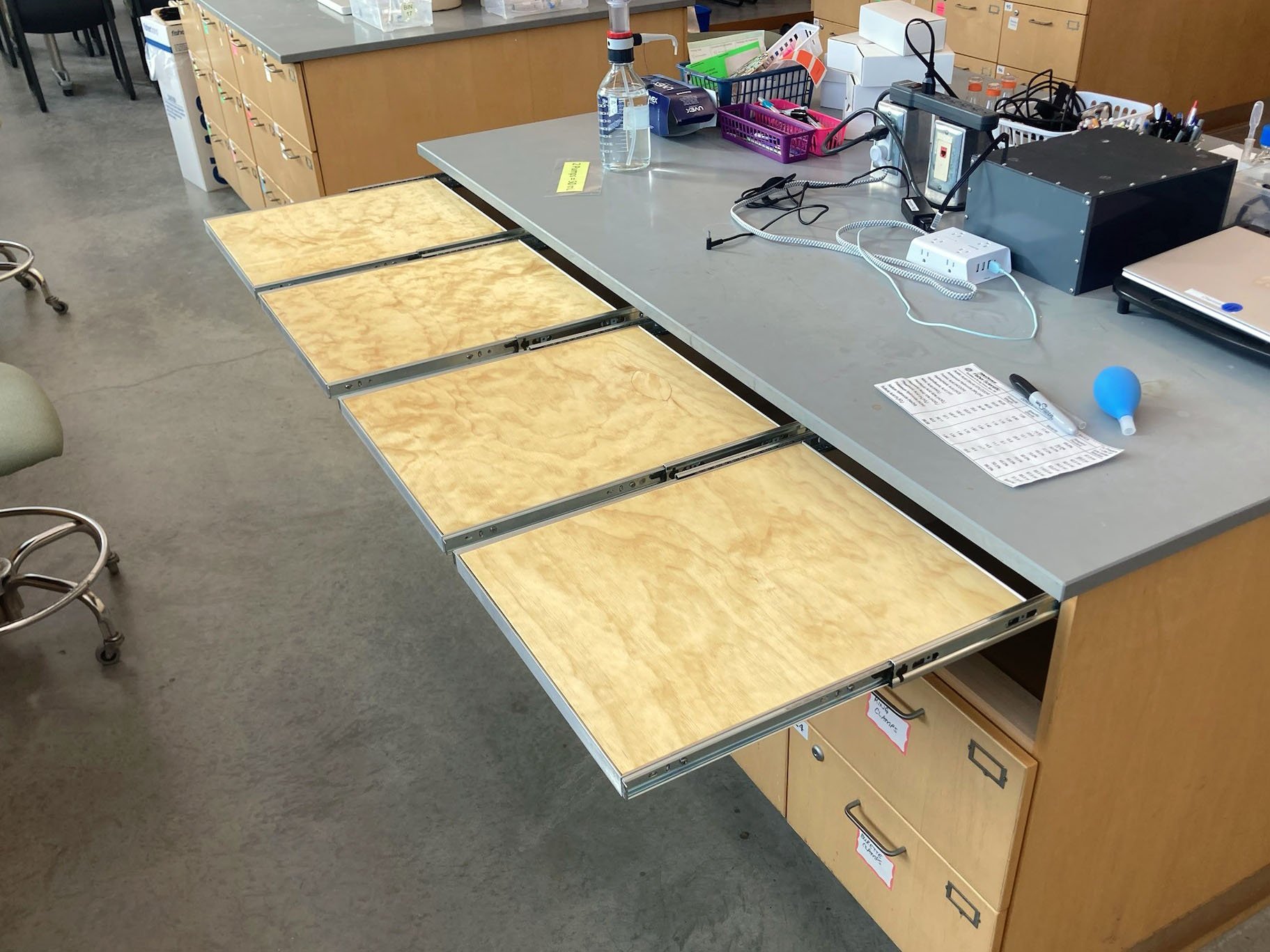 Removed four unused storage drawers from this workbench; fabricated and installed four retractable work surfaces in the General Chemistry Lab.
