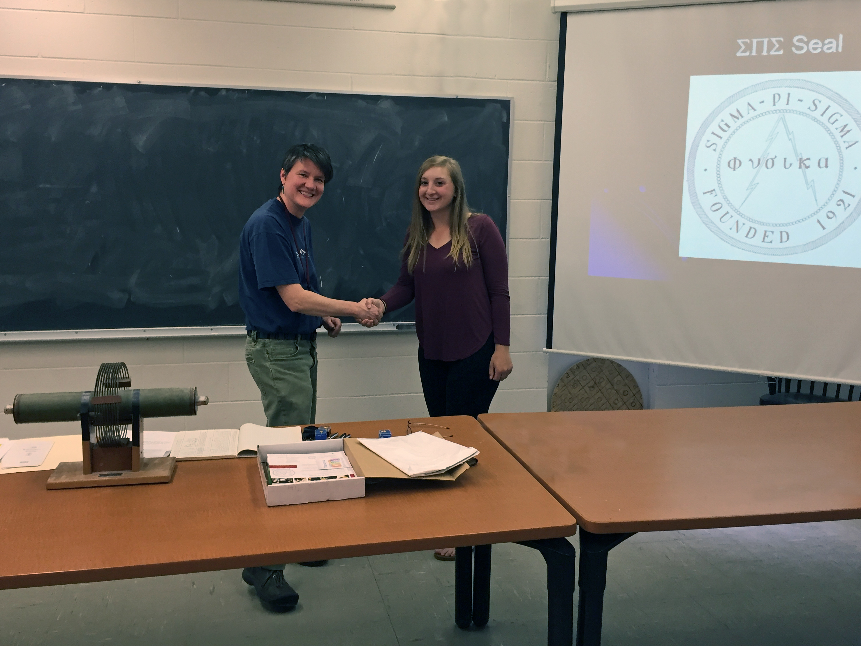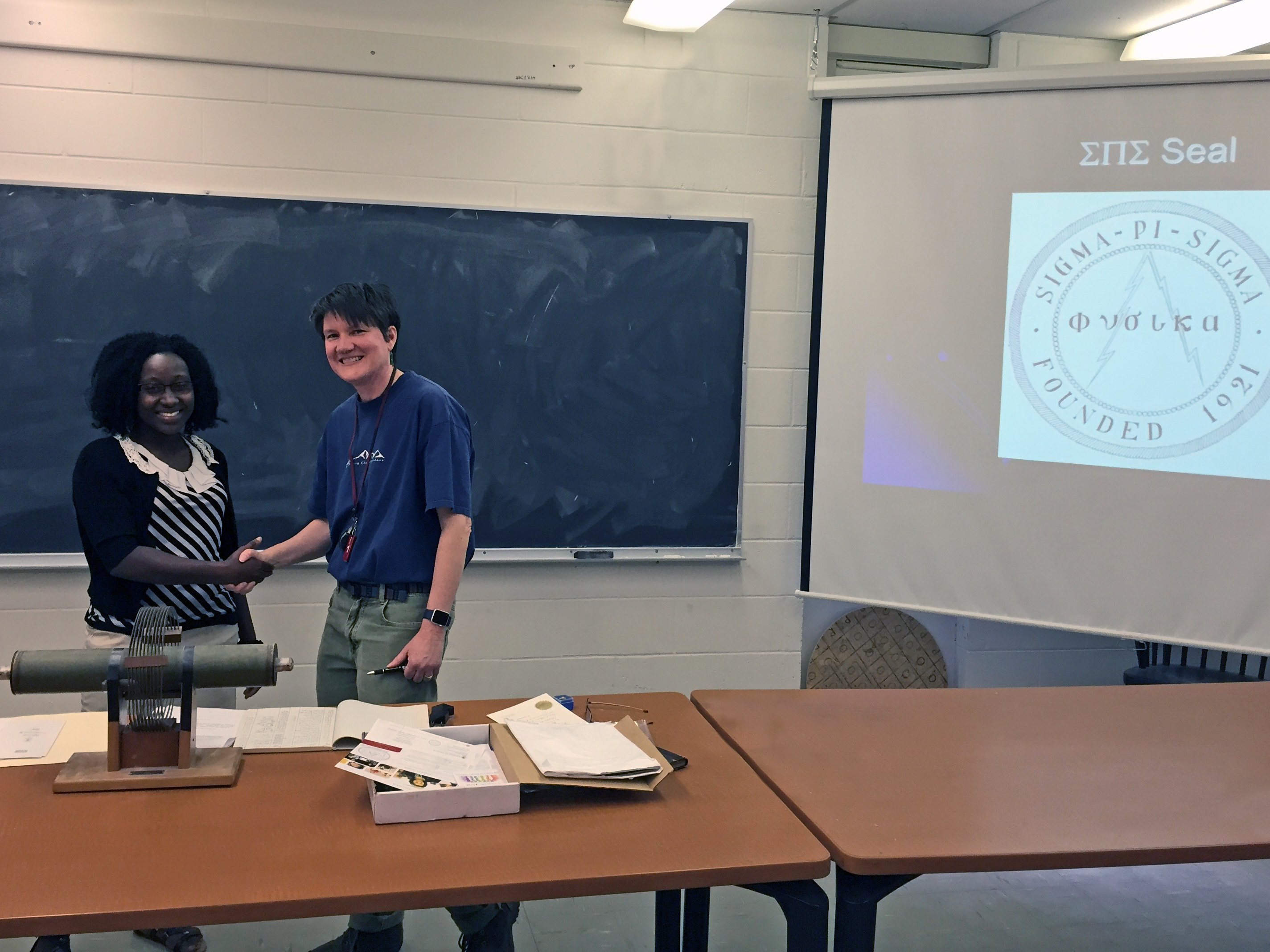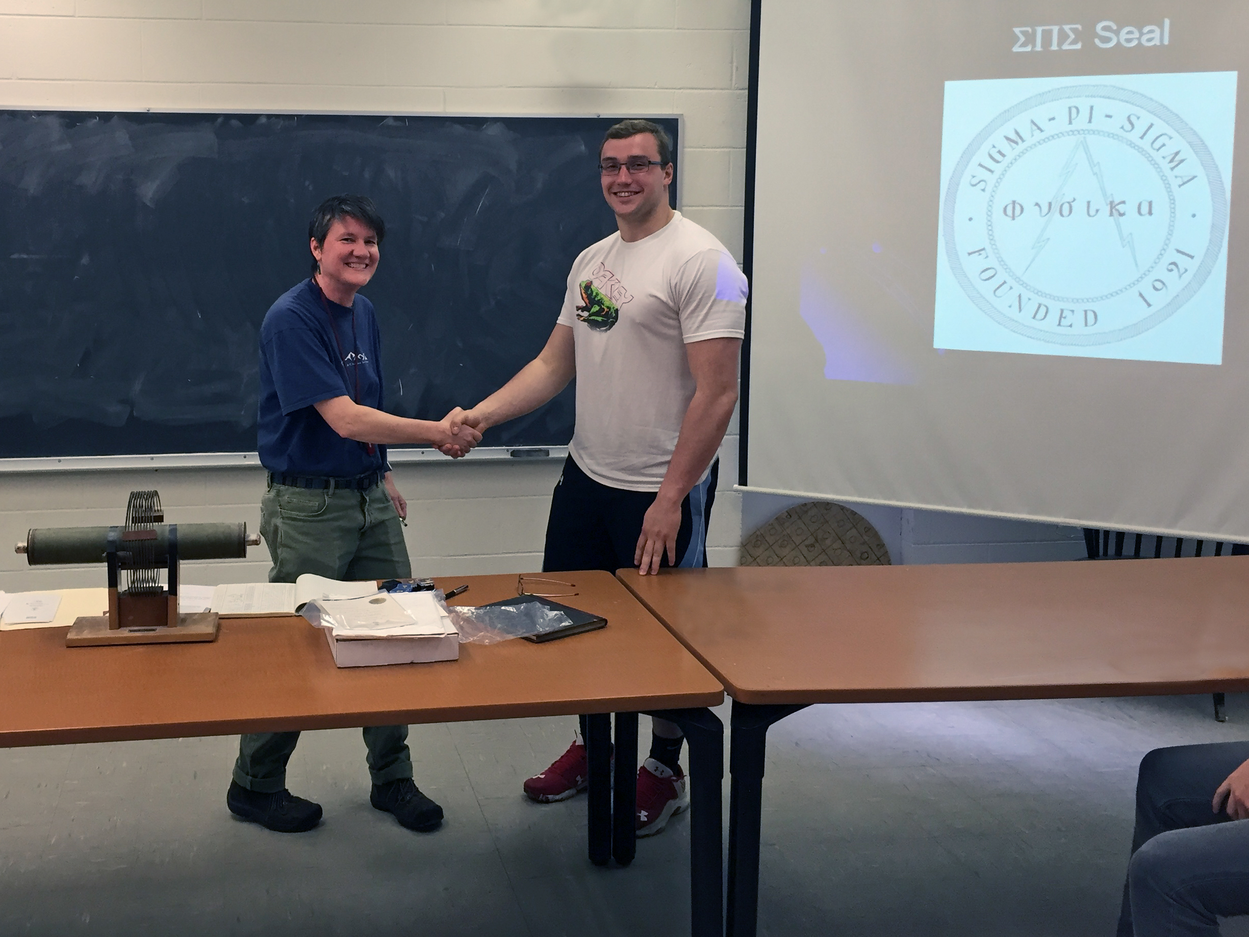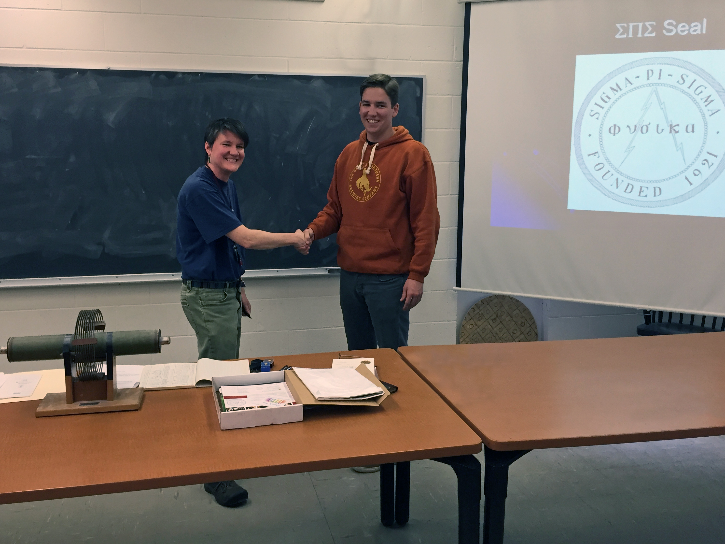 On April 25th, 2016, six students were inducted into Sigma Pi Sigma (ΣΠΣ), the Physics Honorary Society: Nicholas Barclay '17, Kevin Dean '17, Laura Gay '17, Thomas (Riley) Greene '18, Adham Mousa '18 and Francine Nihozeko '18.