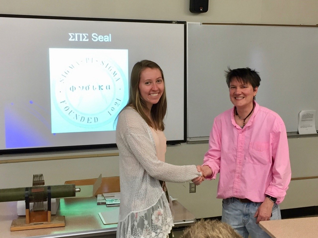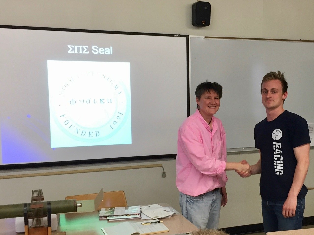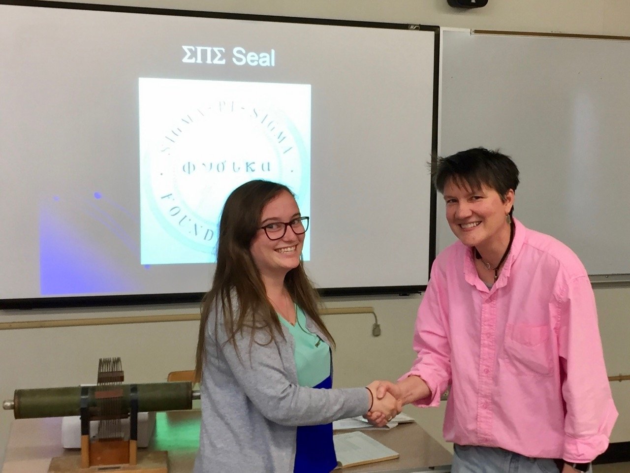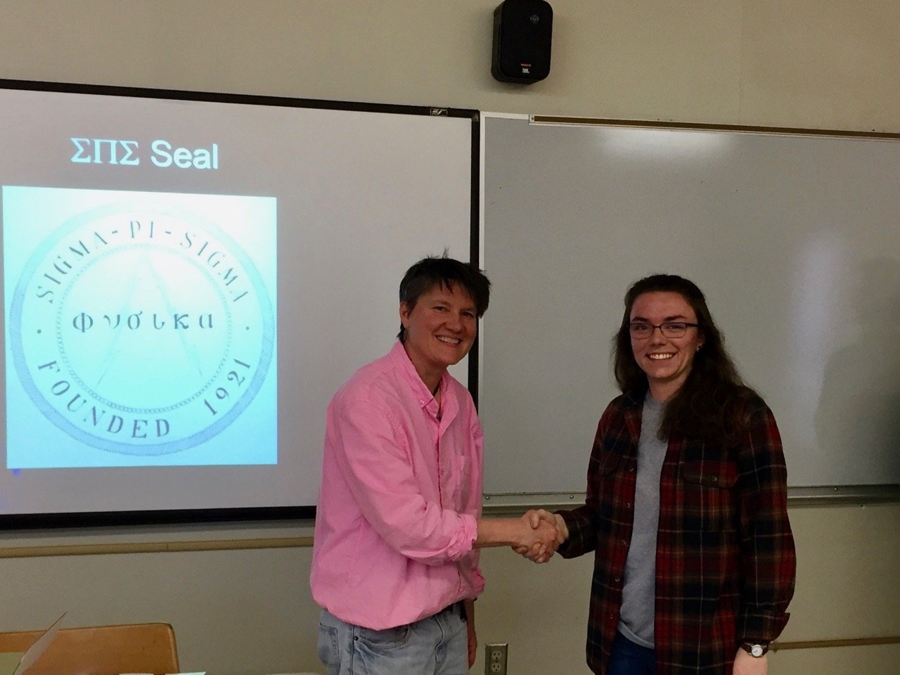 On April 25th, 2017, eleven students were inducted into Sigma Pi Sigma (ΣΠΣ), the Physics Honorary Society: Claire Albrecht '18, Isabel Bogacz '17, Ellis J. (EJ) Curtis, '17, Morgan Doyle '19, Alan Idelkope '19, Stephanie Johnson '17, Emma Kitchner '19, Dustin Ramsay '19, Malakai Takane '18, Alexandra Wagner '19 and Ryan Fletcher '19.