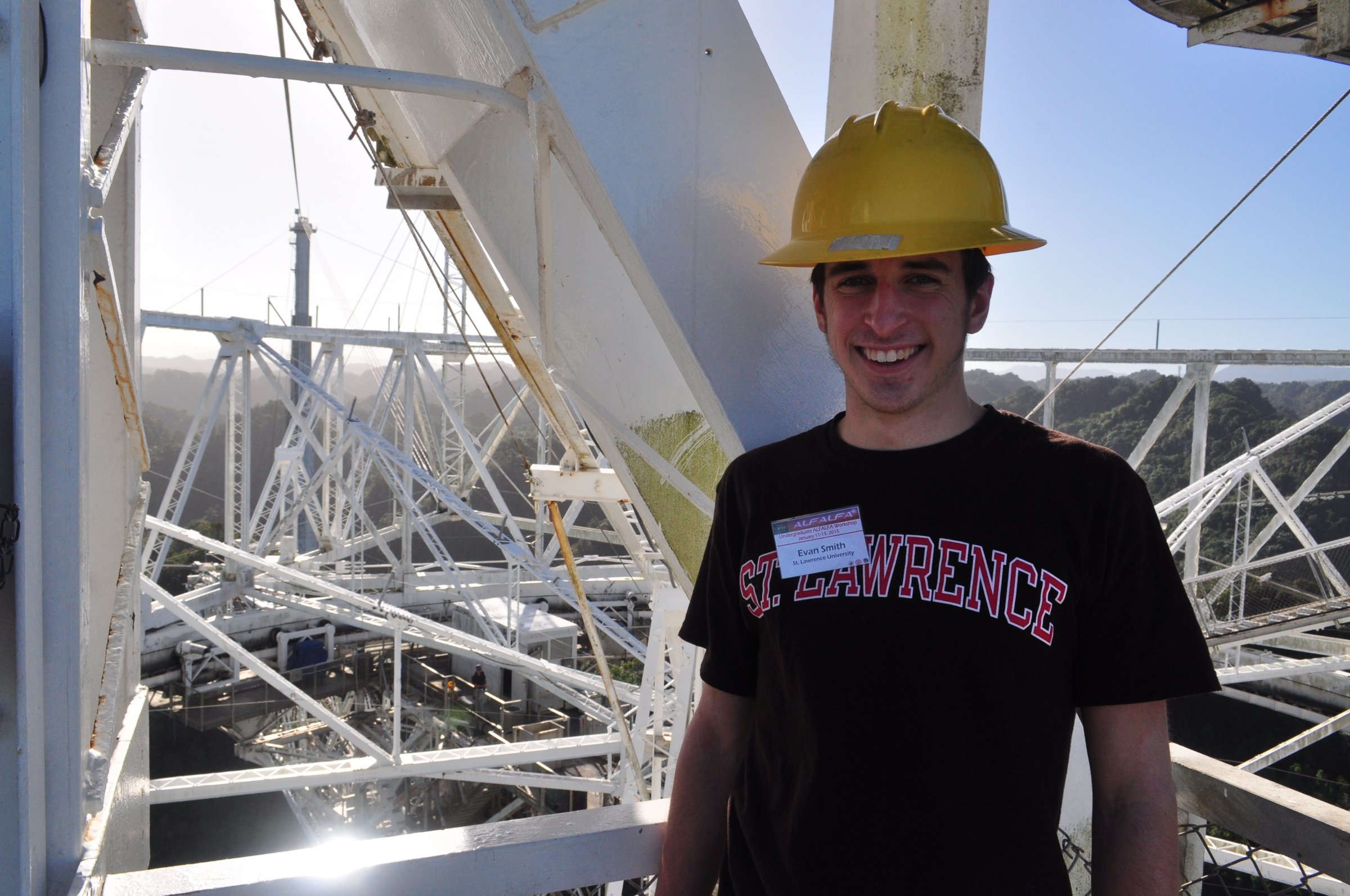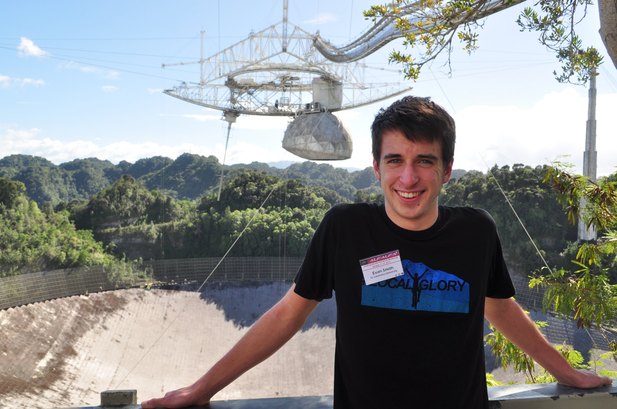 The eighth NSF-sponsored Undergraduate ALFALFA Workshop was held at the Arecibo Observatory on January 11 - 14, 2015. The Workshop is part of the NSF-sponsored Undergraduate ALFALFA Team program to promote undergraduate research within the ALFALFA project. Attendees are given tours of the telescope, and operate it during observing runs. The Workshop was attended by 20 students and their faculty mentors from 13 undergraduate institutions. Evan Smith '16 attended with SLU astronomers Dr. Aileen O'Donoghue and Jeffrey Miller. Evan attended the talks, worked in and presented the results of group projects, and had a chance to run the controls of the largest single dish radio telescope in the world.