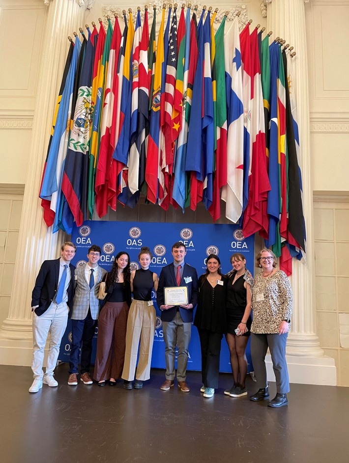 Seven students in the SLU Model OAS Club traveled with Prof. Shelley McConnell to the Organization of American States where they were greeted by Secretary General Luis Almagro and spent four days debating policy with students from 20 universities in the Western Hemisphere. Additionally they visited alum Robert Manogue and colleagues at the US Department of State, and met with diplomats from the Embassy of Belize, the country they represented at this Model, a mock General Assembly of the OAS.