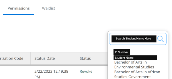 "Student Add Authorization" list showing a student whose authorization can still be revoked and a student who has finished registering for the course.