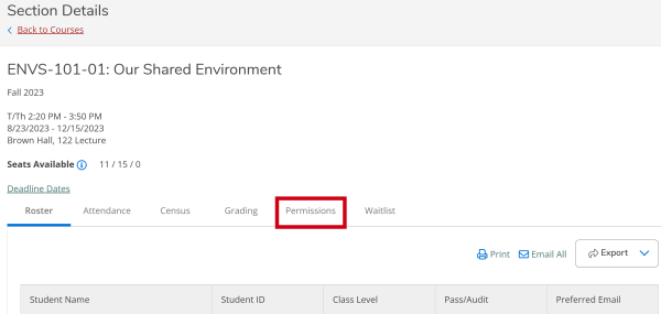 - The selected course section will appear as below. Select the “Permissions” tab.