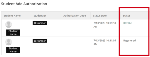 - Within the "Student Add Authorizations" list there will be a "Status" column.