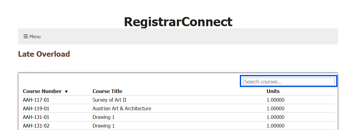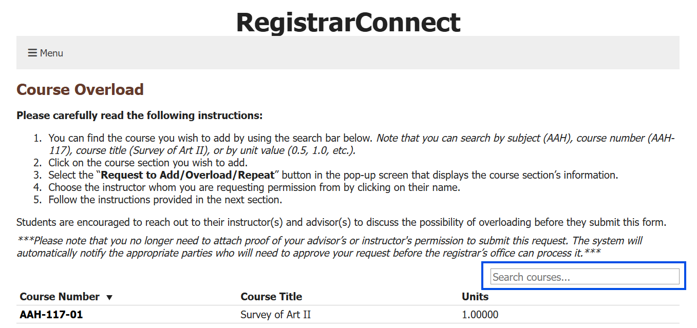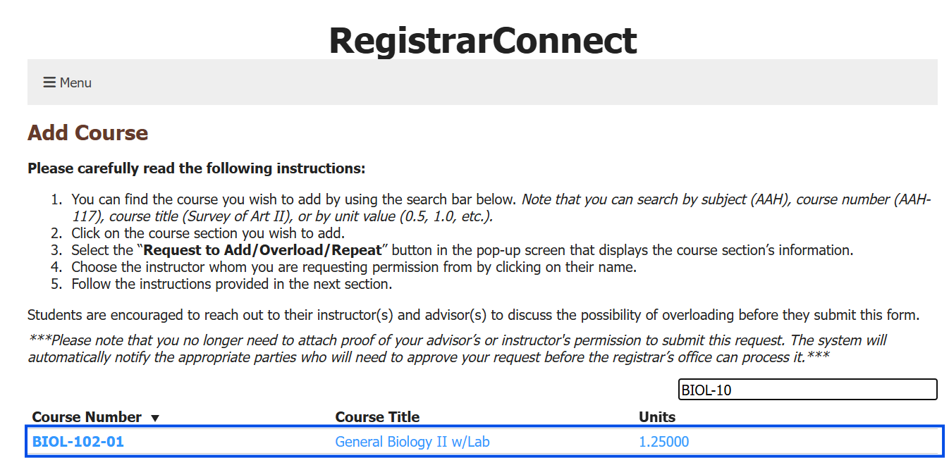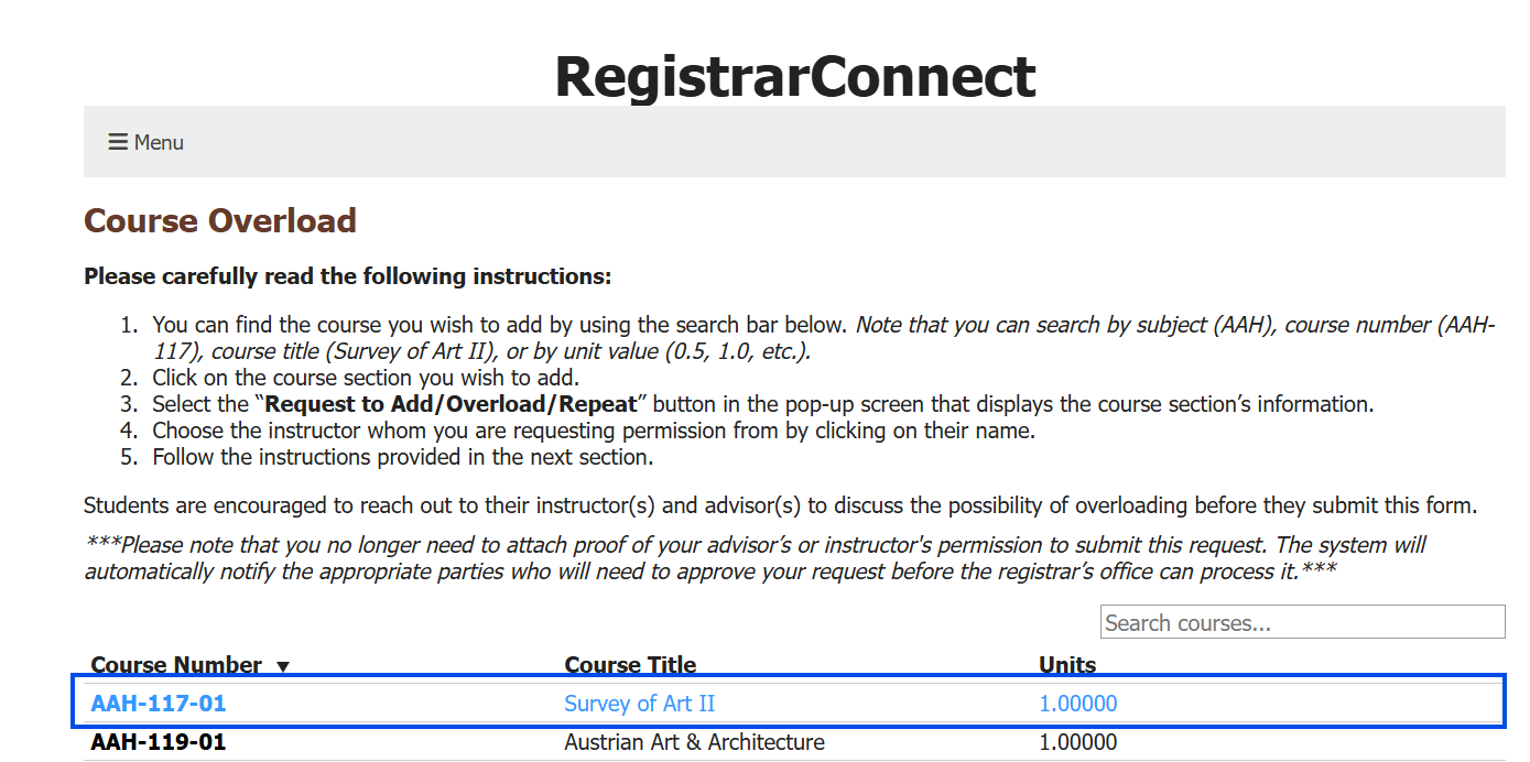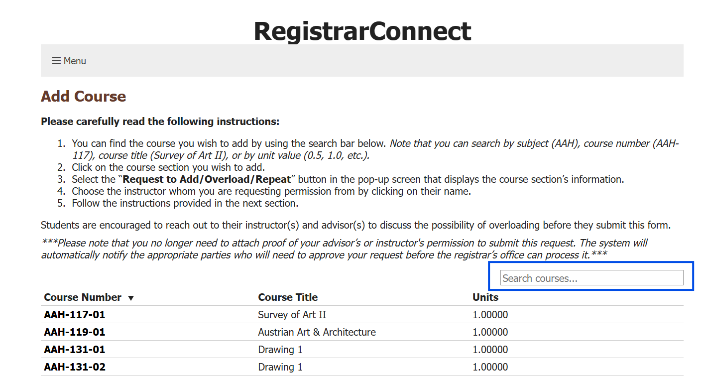 Use the search bar to find the course section you wish to add. You can search by subject (AAH), course number (AAH-117), course title (Survey of Art II), and unit value (0.5, 1.0, etc.).