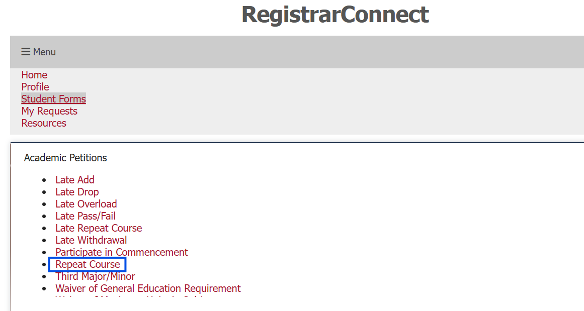 Click on the "Repeat Course" link under the Academic Petitions heading: