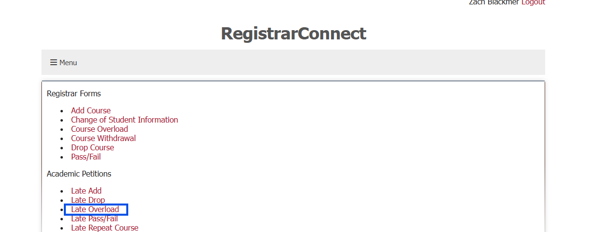 Click on the "Late Overload" link under the Academic Petitions heading: