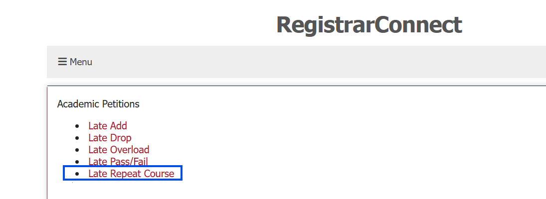 Click on the "Late Repeat Course" link under the Academic Petitions heading: