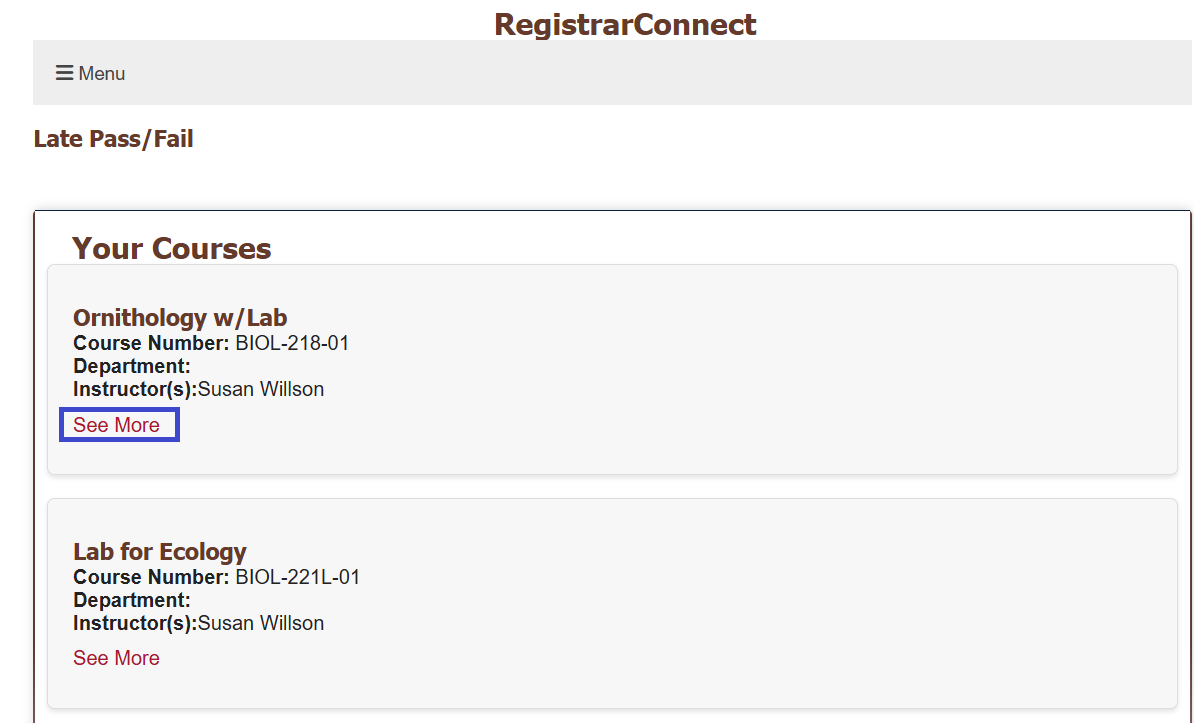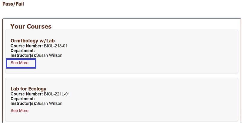 Click on the "See More" link at the bottom of the course section you wish to pass/fail: