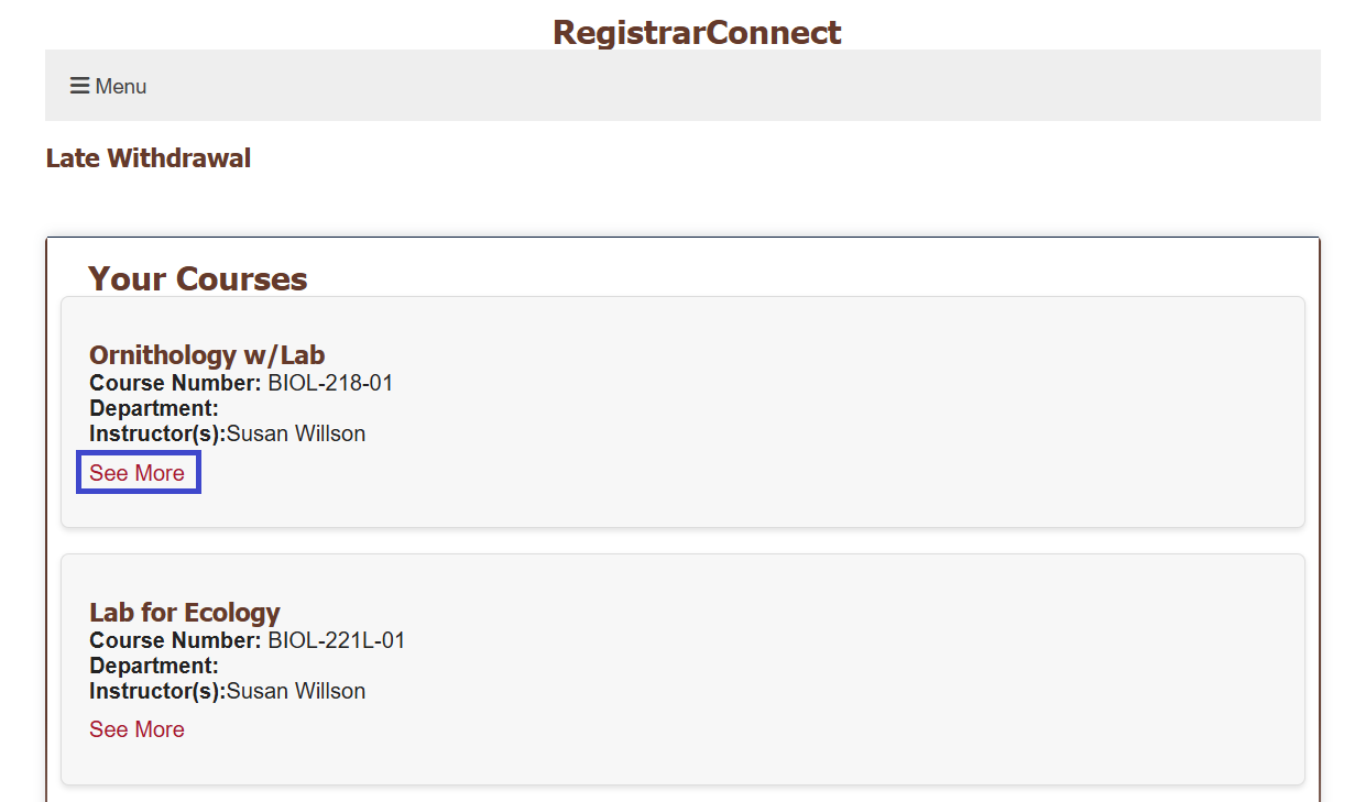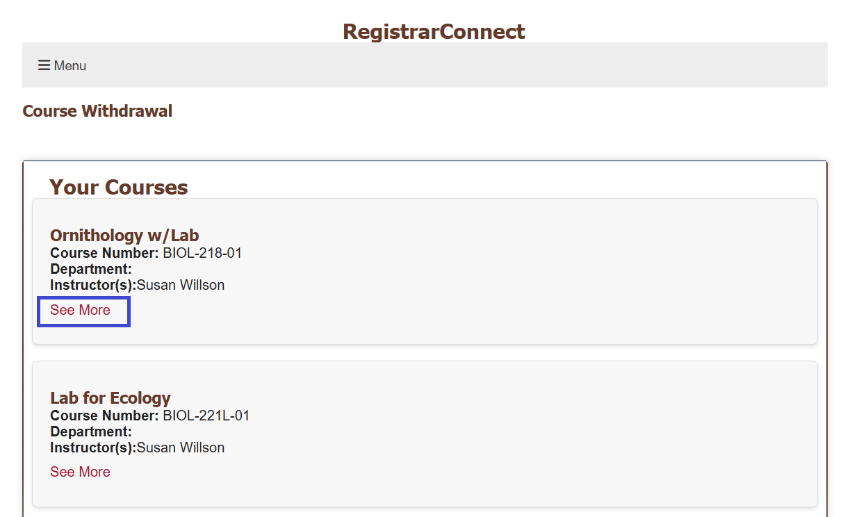 Click on the "See More" link at the bottom of the course section you wish to withdraw from: