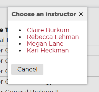 You will see a second pop-up that lists all of the instructors that are teaching this section. Choose which instructor you wish to ask permission from to add the course. If there is only one instructor listed on the section then you must click on that name to proceed.