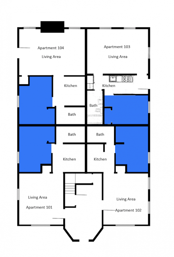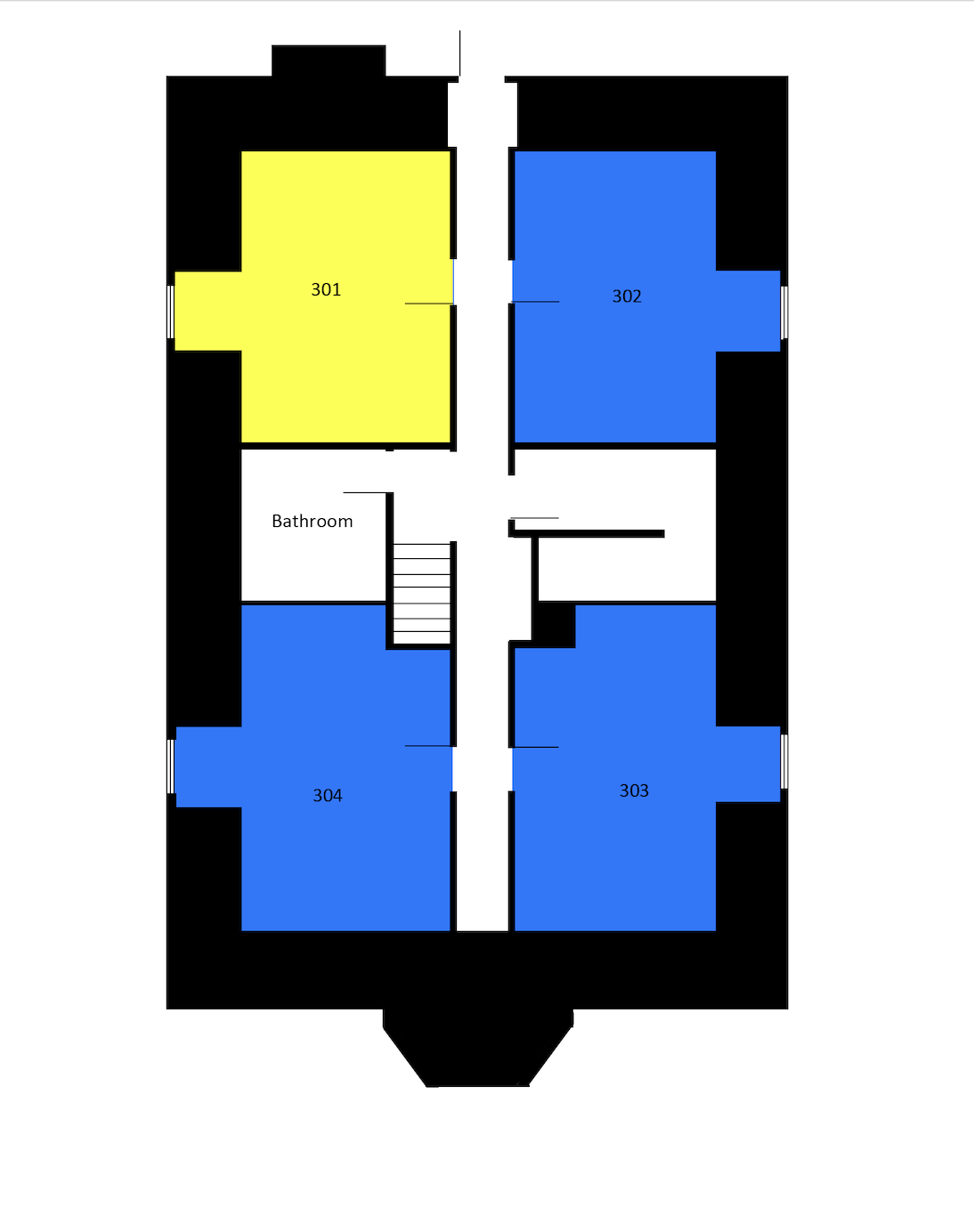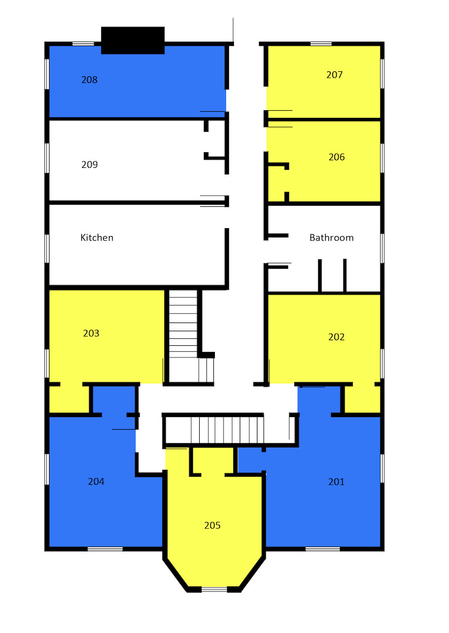 This upperclass building includes four senior apartments on the first floor and two additional floors of traditional style housing (with double and single rooms) that is currently theme living.