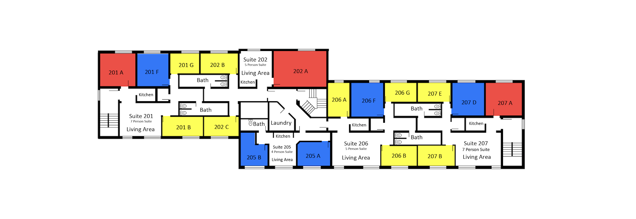 Located near the center of campus, Hulett and Jencks offer both single, double, and suite living spaces. The suites house two to seven students that share a kitchenette, living space and bathroom. To the right are pictures of a two-person suite in Jencks Hall.