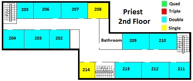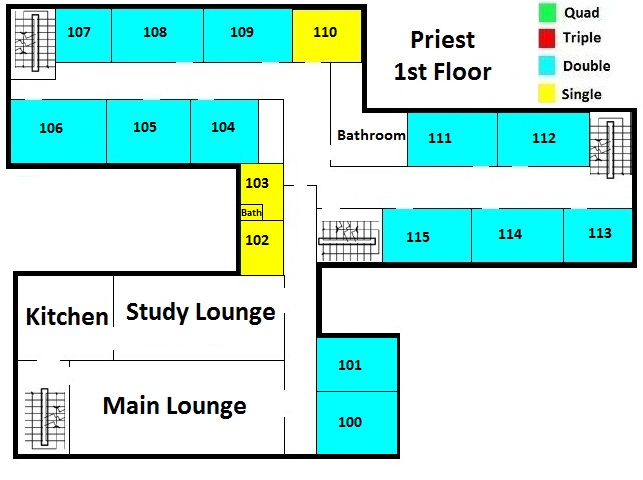 One of three buildings with similar architecture, Priest College is located at 3 Maple Street, just across the street from Sykes and the Brewer Bookstore. Home to 53 students, Priest offers the opportunity for the development of a close-knit living environment due to its size. This building also has a large common lounge space, computer workstations, and a kitchen.