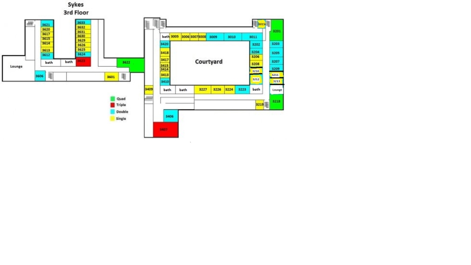 Each floor offers unique living arrangements with singles, doubles, triples, and quads. Dana Dining hall is adjacent to Sykes allowing residents to attend meals in their slippers. Additionally, Sykes features the elegant Sykes Formal Lounge and outdoor courtyards.