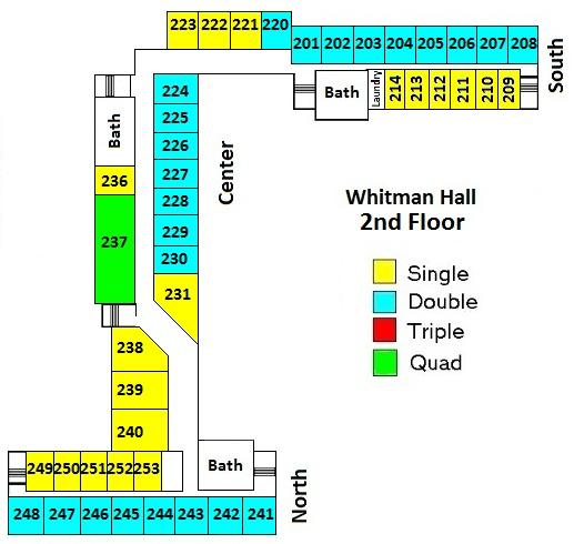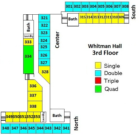 Bathrooms: Ten restrooms throughout the building with some designated for women and others for men. These restrooms have three showers, three sinks, and four bathroom stalls. The restrooms on the first floor of the center wing have three showers, two sinks, and two bathroom stalls. Areas of Whitman housing only upperclass students have the option of making the bathrooms co-ed at the start of each semester, when the Community Assistant facilitates the voting process.
