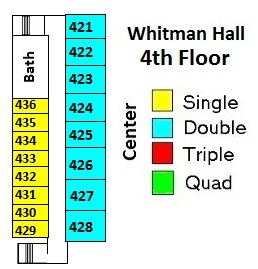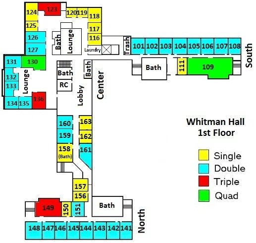 Whitman Hall houses both first-year and upperclass students and is centrally located on campus. The Wellness Floor for upperclass students is also housed on a portion of the first floor.