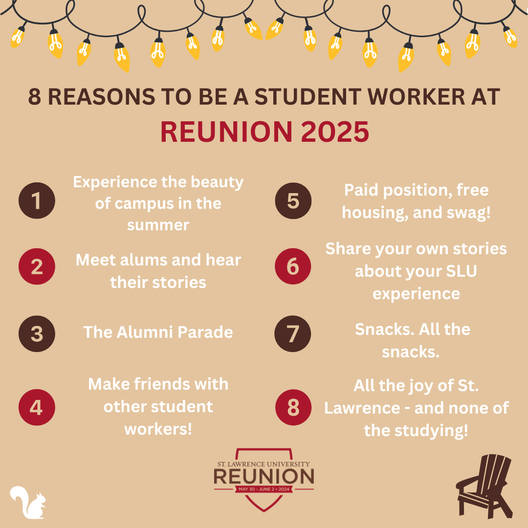 Reunion Weekend Student Ambassador positions are only open to current St. Lawrence University undergraduate and graduate students, incoming St. Lawrence first-years and recent St. Lawrence graduates in the Class of 2025.