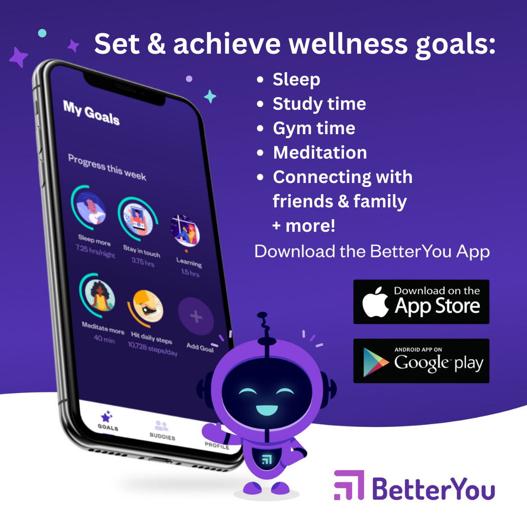 St. Lawrence partners with BetterYou, a wellness companion app that students can use to habit stack. Set goals to improve sleep, study habits, exercise, and more. Plus, students earn rewards (free gift cards!) for onboarding with the app and meeting their goals. We regularly run challenges through the app, including campus-wide step challenges and sleep challenges, during which students who demonstrate the most gains toward their personal goals have opportunities to win prizes! Current students should sign up using their stlawu email address on the App Store or GooglePlay.