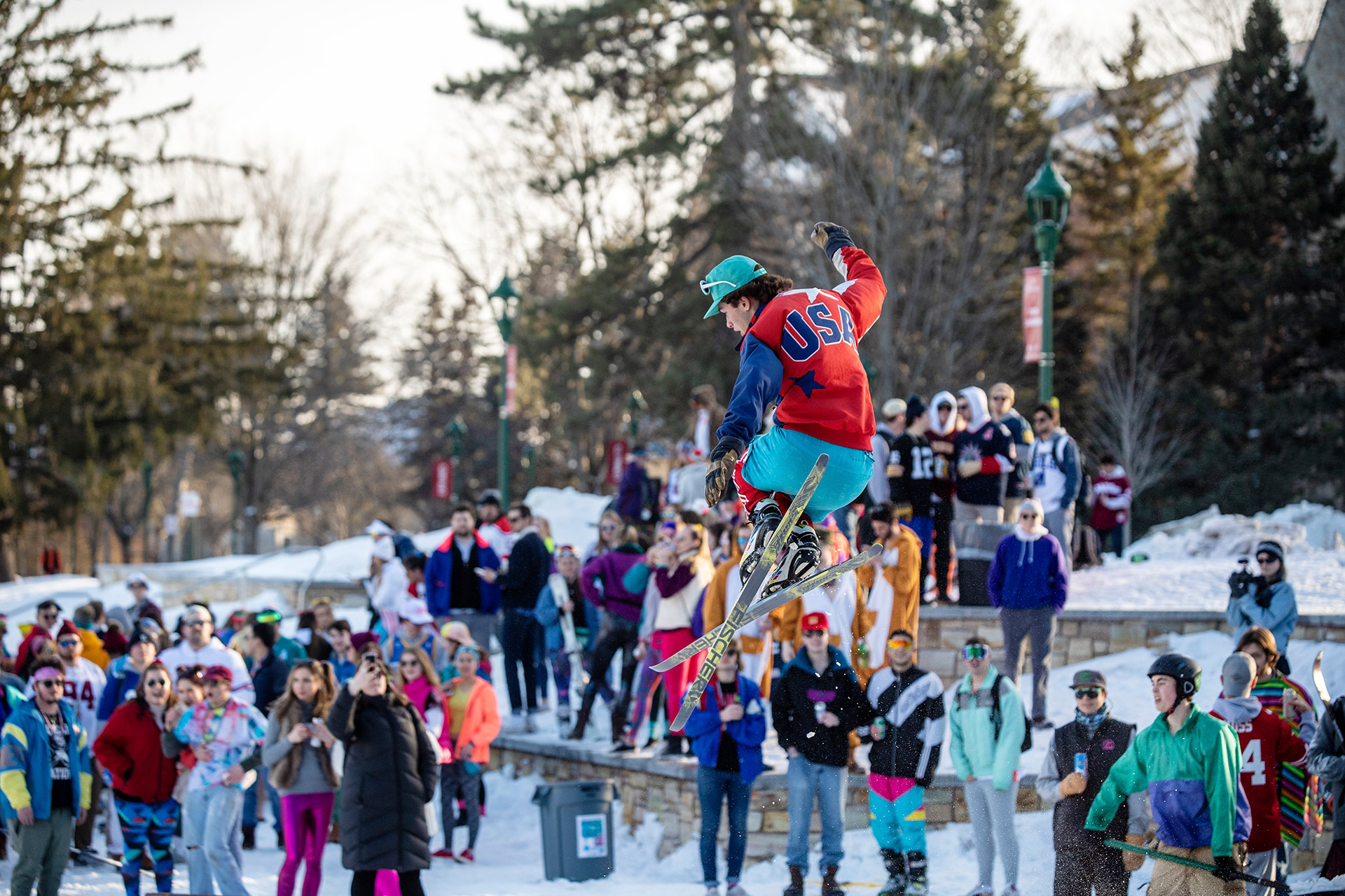There’s no such thing as bad weather at St. Lawrence—only opportunities to make the most of the snow Mother Nature throws our way. For Rail Jam, the Outing Club builds a rail on the Brush Memorial Quad where students can ski and snowboard on campus.
